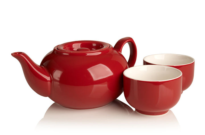 This elegant ceramic teapot has a beautiful rich red glaze! Includes a large stainless steel infuser, which is perfect for steeping 3-4 cups of tea. The white inside glaze provides a classy finish. Add the matching 2 piece cup set for a complete tea service.