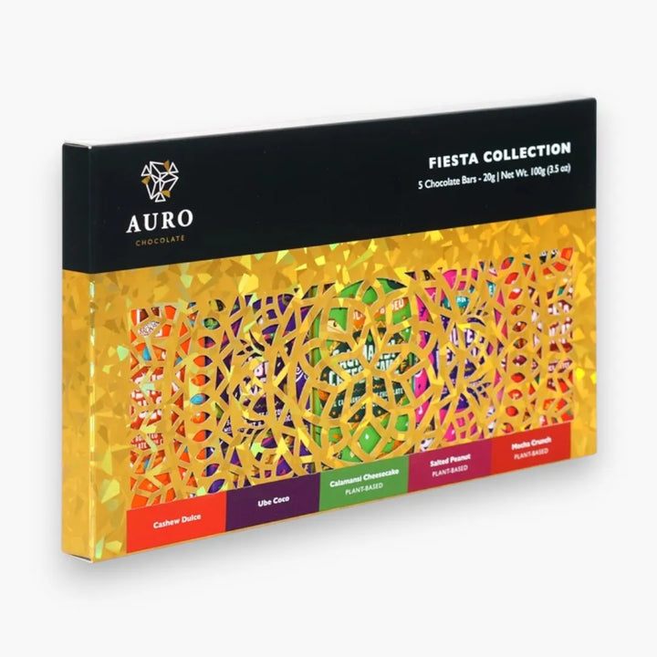 Discover a celebration of tropical tastes with Auro's premium chocolate Fiesta Collection, ethically and sustainably sourced directly from Davao, Philippines. Each bar offers a unique flavor explosion in every bite! Here is what's included: White Cashew Dulce 32%, White Calamansi Cheesecake 34%, Milk Salted Peanut 47%, and Dark Mocha Crunch 55%, White Ube Coco w/ Rice 32%