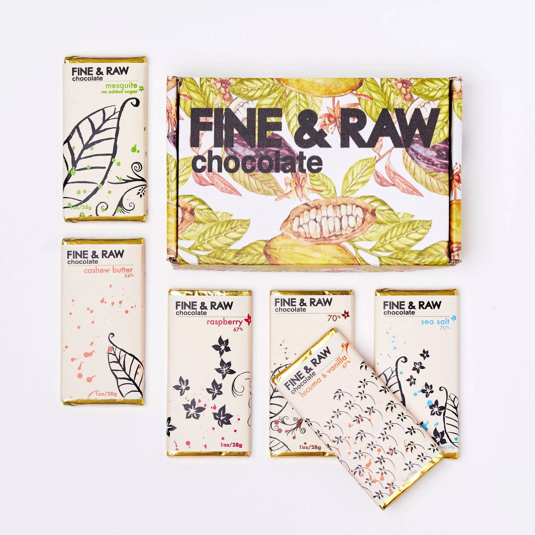 This box comes with (6) 1 oz. Signature Collection chocolate bars. The selection of bars is carefully chosen by the Fine & Raw head chocolatiers.