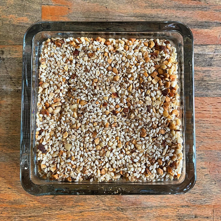 Dukkah is an exquisite Egyptian blend of sesame, hazelnut, almond, coriander, black pepper, and salt that is traditionally served with olive oil and bread. The bread is dipped in the olive oil and then generously dipped into the dukkah blend for a toasty, nutty, and slightly spicy flavor.