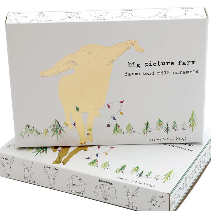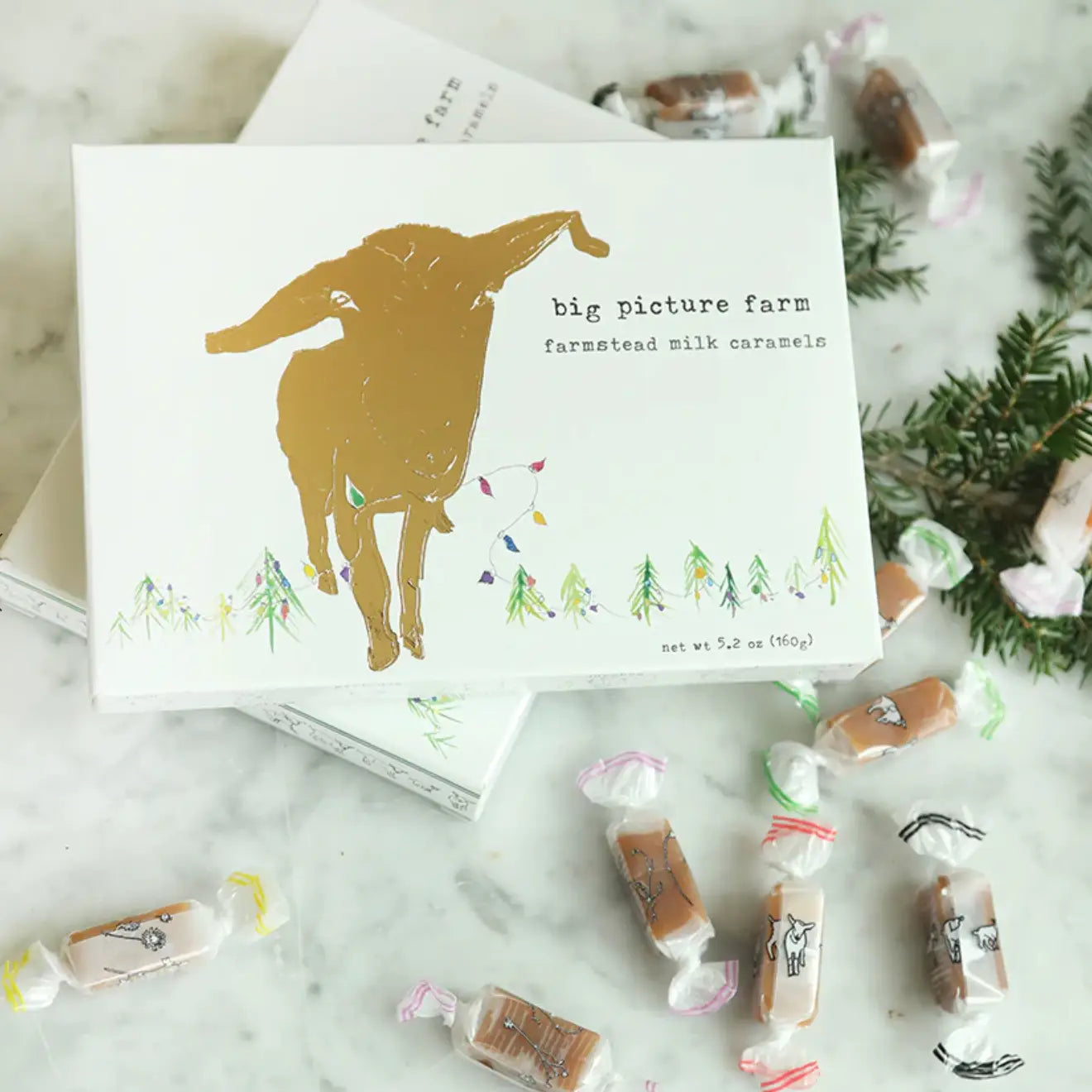 The Golden Goat Holiday Gift Box is filled with 20 award-winning salt & vanilla caramels, These dreamy caramels are made in Vermont with goat milk from Big Picture Farms and literally melt in your mouth. This is a gift that will delight all: young and old, alike.