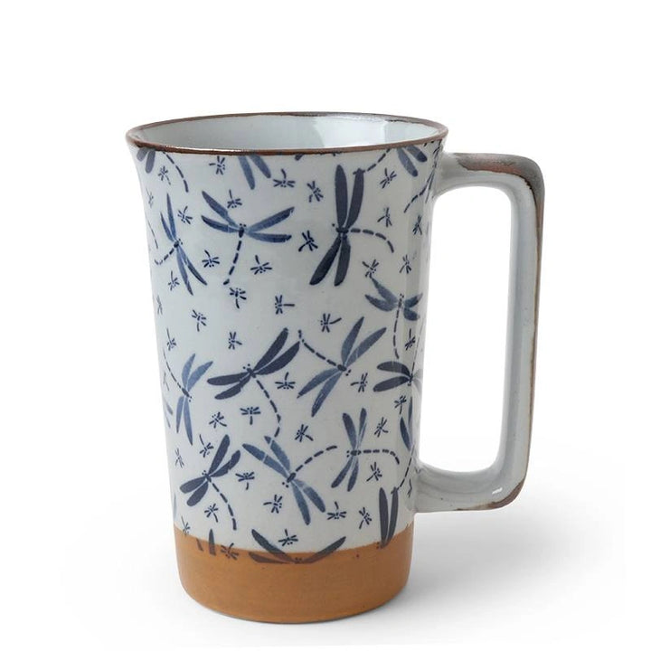 Classic blue ceramic tea or latte mug with a beautiful dragonfly motif. The solid design has a vintage look and feel. Enjoy your morning cup in fine style!